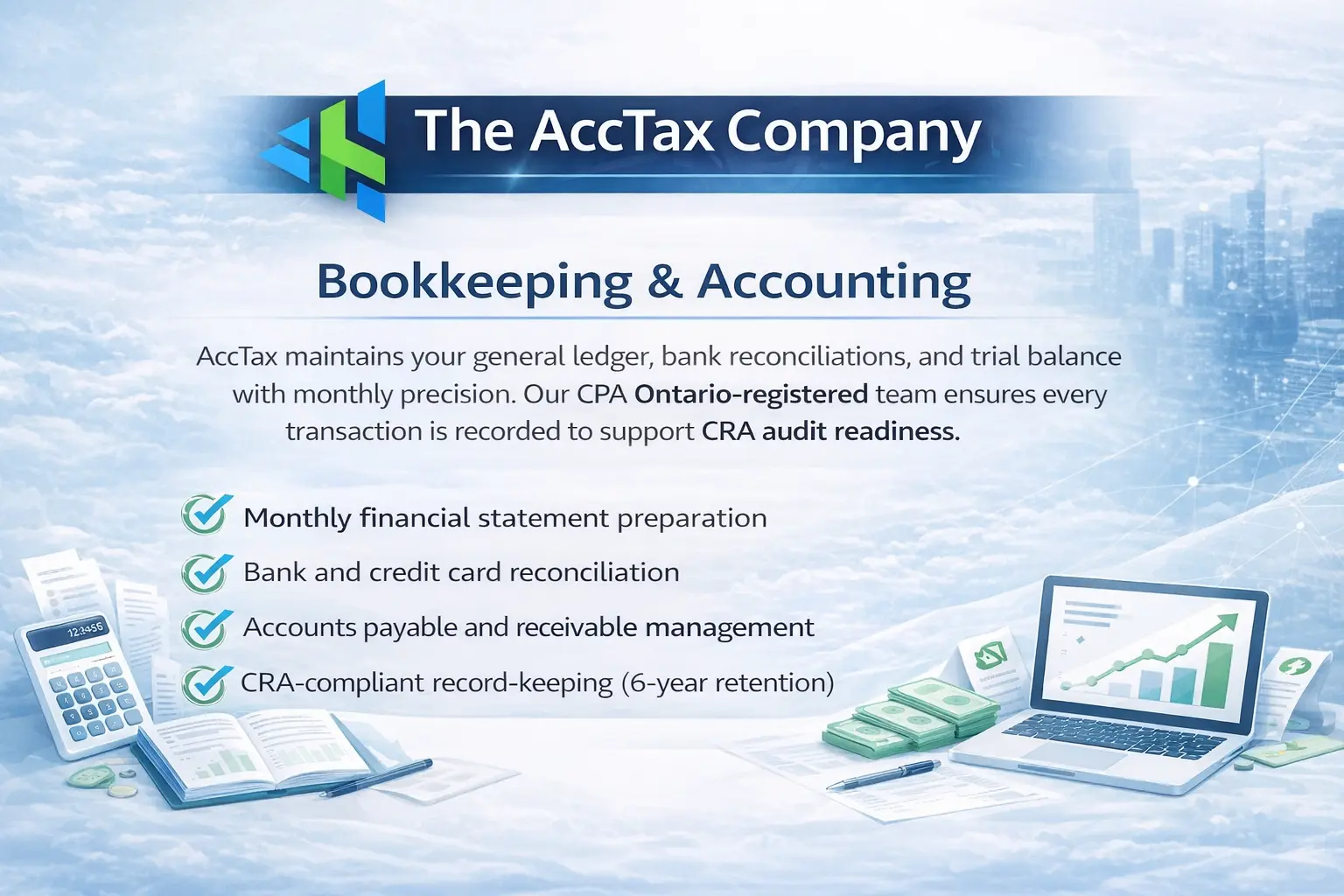 Acctax sets up bookkeeping systems for Ontario grant recipients that satisfy CRA documentation standards. Bookkeeping Services for Ontario Small Businesses at Acctax include grant income setup, expense categorization, and monthly reconciliation. Monthly bookkeeping ensures grant-funded expenses are categorized correctly before year-end. Bookkeeping at Acctax keeps Ontario businesses CRA-ready every month, not only at tax time.